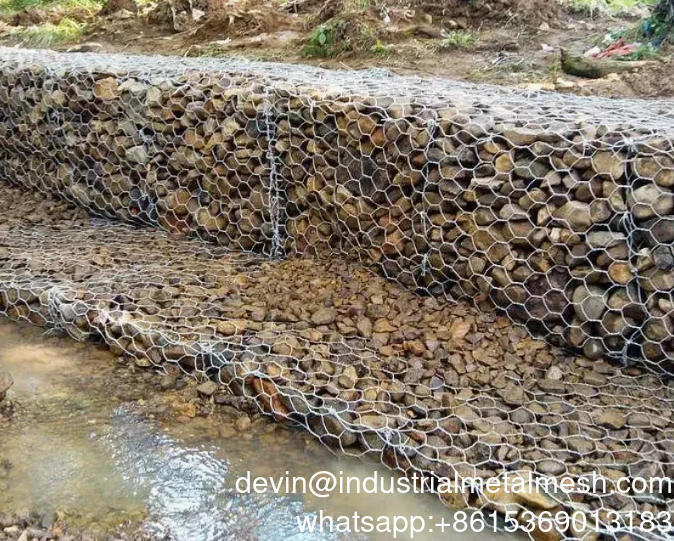 Hộp Gabionbao gồm các đơn vị hình chữ nhật, được chế tạo từ một lưới hình sáu góc xoắn kép, được lấp đầy bằng đá.Các cạnh của nó với một sợi có đường kính dày hơn sợi lướiCác hộp Gabion được chia thành các tế bào bởi mảng trong mỗi 1 mét.